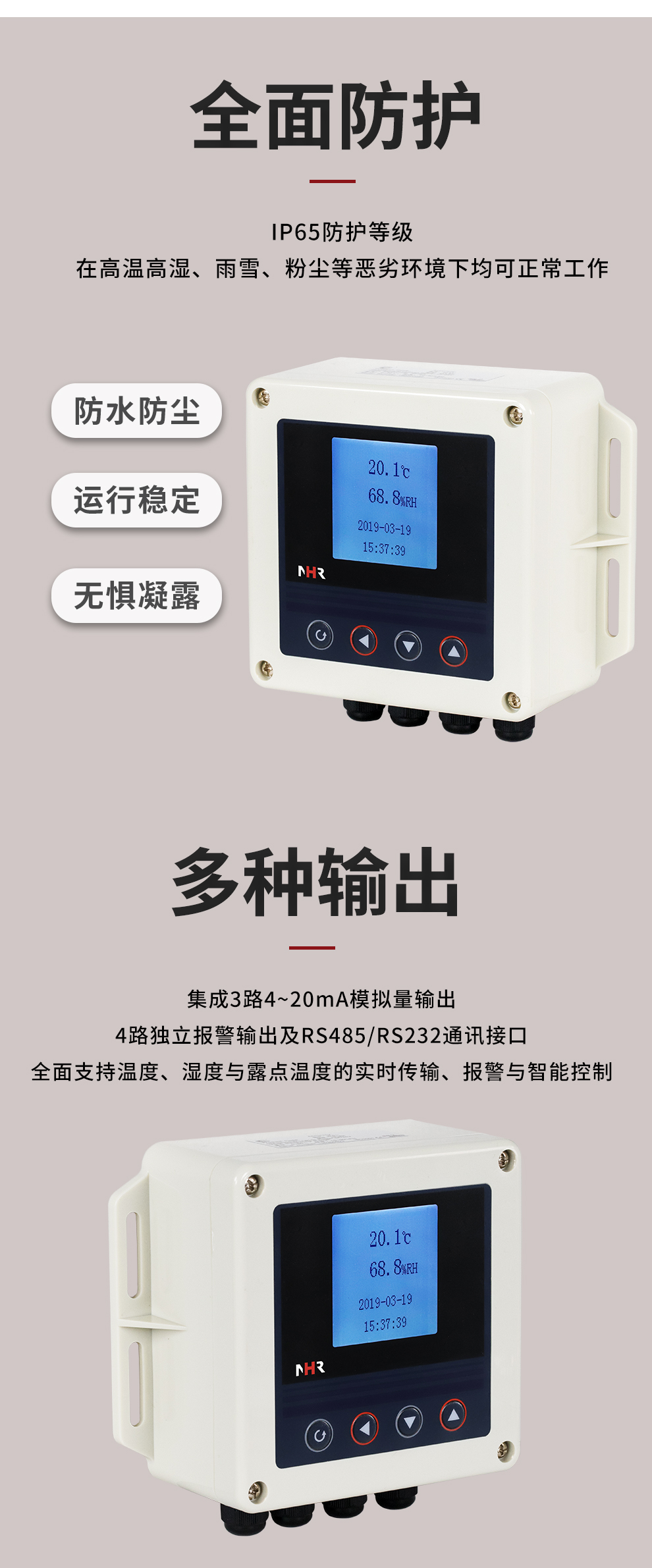 虹潤公司是專業(yè)生產(chǎn)環(huán)境監(jiān)測儀表的國家專精特新“小巨人”企業(yè)。生產(chǎn)的壁掛式溫濕度控制器,具有溫度、濕度、露點(diǎn)高精準(zhǔn)的測量,多種輸出類型,穩(wěn)定性強(qiáng),RS485/RS232通訊,IP65防護(hù)等級等特點(diǎn)。產(chǎn)品獲得一種手持式低功耗溫濕度檢測儀、大屏幕溫濕度記錄儀等2項國家發(fā)明專利,主持起草物聯(lián)網(wǎng)智能溫度儀表通用技術(shù)條件、冷鏈溫度記錄儀等2項國家標(biāo)準(zhǔn),通信系統(tǒng)多通道數(shù)據(jù)采集控制終端規(guī)范軍用標(biāo)準(zhǔn),以及現(xiàn)場設(shè)備集成等5項智能制造國家標(biāo)準(zhǔn),參與國際5G標(biāo)準(zhǔn)制定,取得溫濕度儀表等2項相關(guān)軟件著作權(quán)。產(chǎn)品廣泛應(yīng)用于工業(yè)現(xiàn)場、農(nóng)業(yè)大棚、倉儲物流、地下管廊、養(yǎng)殖孵化、配電機(jī)房等諸多領(lǐng)域。