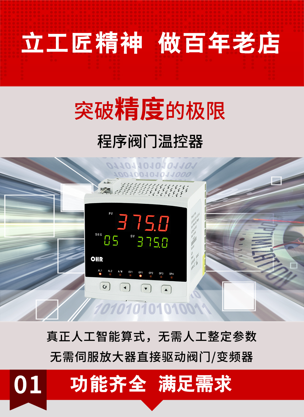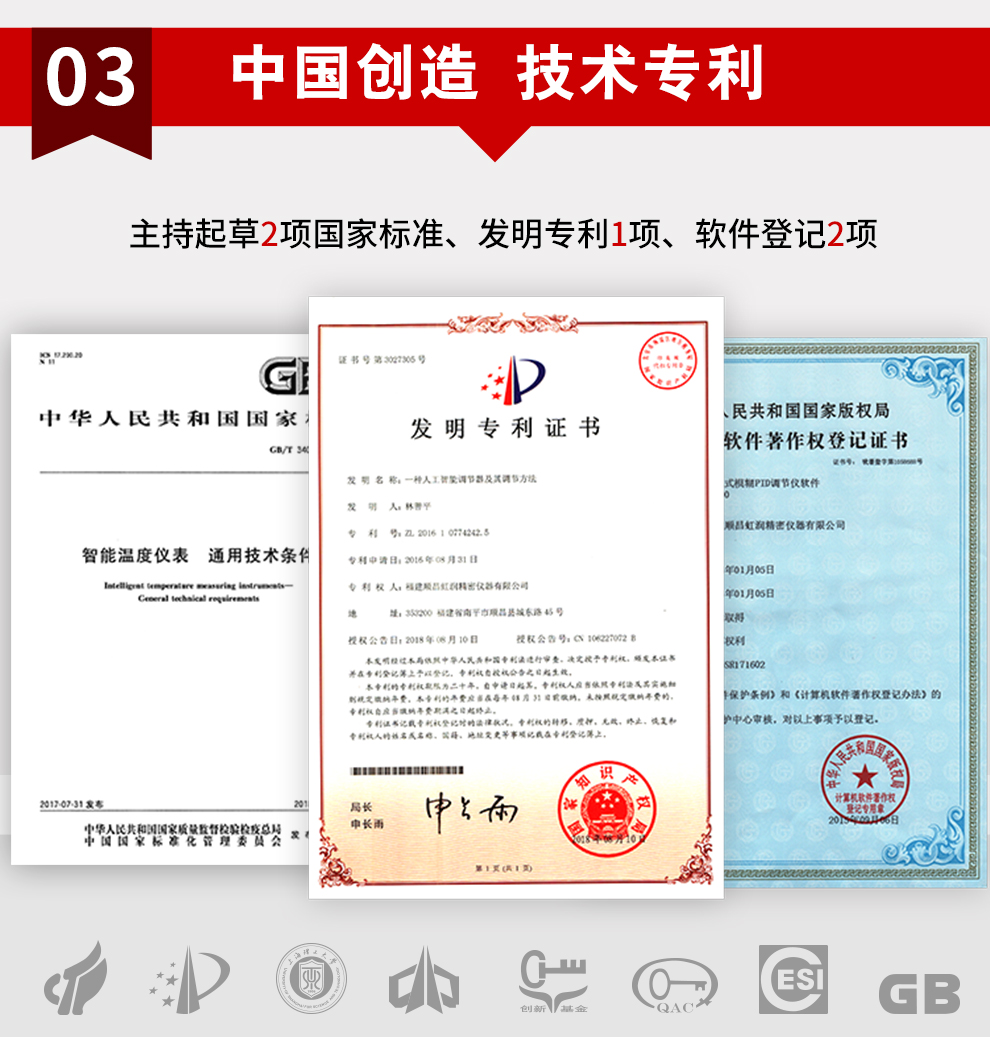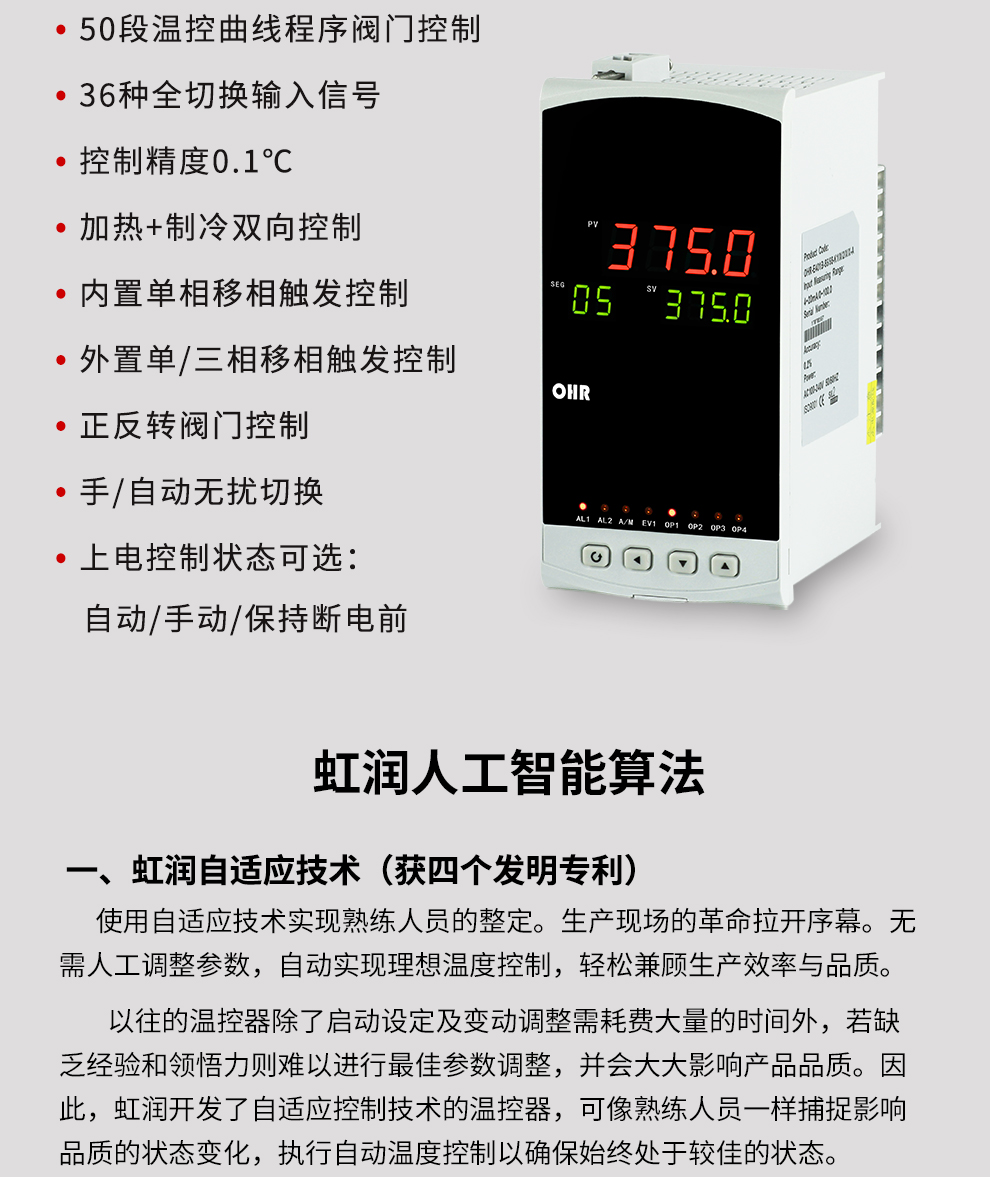 虹潤公司是專業(yè)生產(chǎn)溫控器的國家專精特新“小巨人”企業(yè)。生產(chǎn)的程序閥門溫控器,具有50段溫控程序控制,真正人工智能算式,無需人工整定參數(shù),控制精度可達±0.1°C,加熱制冷雙向控制等特點。產(chǎn)品獲得模糊PID控制儀及控制方法、人工智能調(diào)節(jié)器、智能化控制器、移相觸發(fā)控制器、閥門自動手動無擾動操作控制方法及裝置等5項國家發(fā)明專利,主持起草智能溫度儀表通用技術條件、工業(yè)過程控制系統(tǒng)用模擬輸入兩位或多位輸出儀表、工業(yè)過程測量和控制系統(tǒng)用智能調(diào)節(jié)器等3項國家標準,,以及通信系統(tǒng)多通道數(shù)據(jù)采集控制終端規(guī)范軍用標準,參與國際5G標準制定,取得增強型分段調(diào)節(jié)器等3項相關軟件著作權(quán)。產(chǎn)品廣泛應用于電力、石化,冶金、制藥、食品等幾乎所有工業(yè)現(xiàn)場,實現(xiàn)精準控溫,保障生產(chǎn)安全與質(zhì)量。