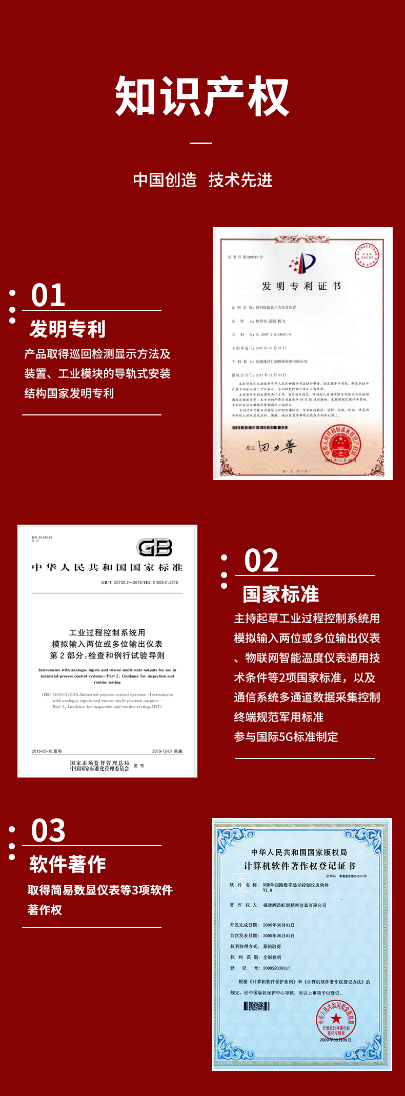 虹潤公司是專業(yè)生產(chǎn)數(shù)顯表的國家專精特新“小巨人”企業(yè),生產(chǎn)的導(dǎo)軌式數(shù)顯儀表,具有全切換信號輸入,導(dǎo)軌壁掛共用,全隔離設(shè)計,高抗干擾,變送輸出或RS485通訊等特點。產(chǎn)品獲得巡回檢測顯示方法及裝置、工業(yè)模塊的導(dǎo)軌式安裝結(jié)構(gòu)等2項國家發(fā)明專利,主持起草工業(yè)過程控制系統(tǒng)用模擬輸入兩位或多位輸出儀表、物聯(lián)網(wǎng)智能溫度儀表通用技術(shù)條件等2項國家標(biāo)準(zhǔn),,以及通信系統(tǒng)多通道數(shù)據(jù)采集控制終端規(guī)范軍用標(biāo)準(zhǔn),參與國際5G標(biāo)準(zhǔn)制定,取得簡易數(shù)顯儀表等3項相關(guān)軟件著作權(quán)。產(chǎn)品廣泛應(yīng)用于電力、石化、冶金、化工、造紙、食品、輕工、制藥、熱處理、水處理、機(jī)械配套等各種工業(yè)現(xiàn)場。