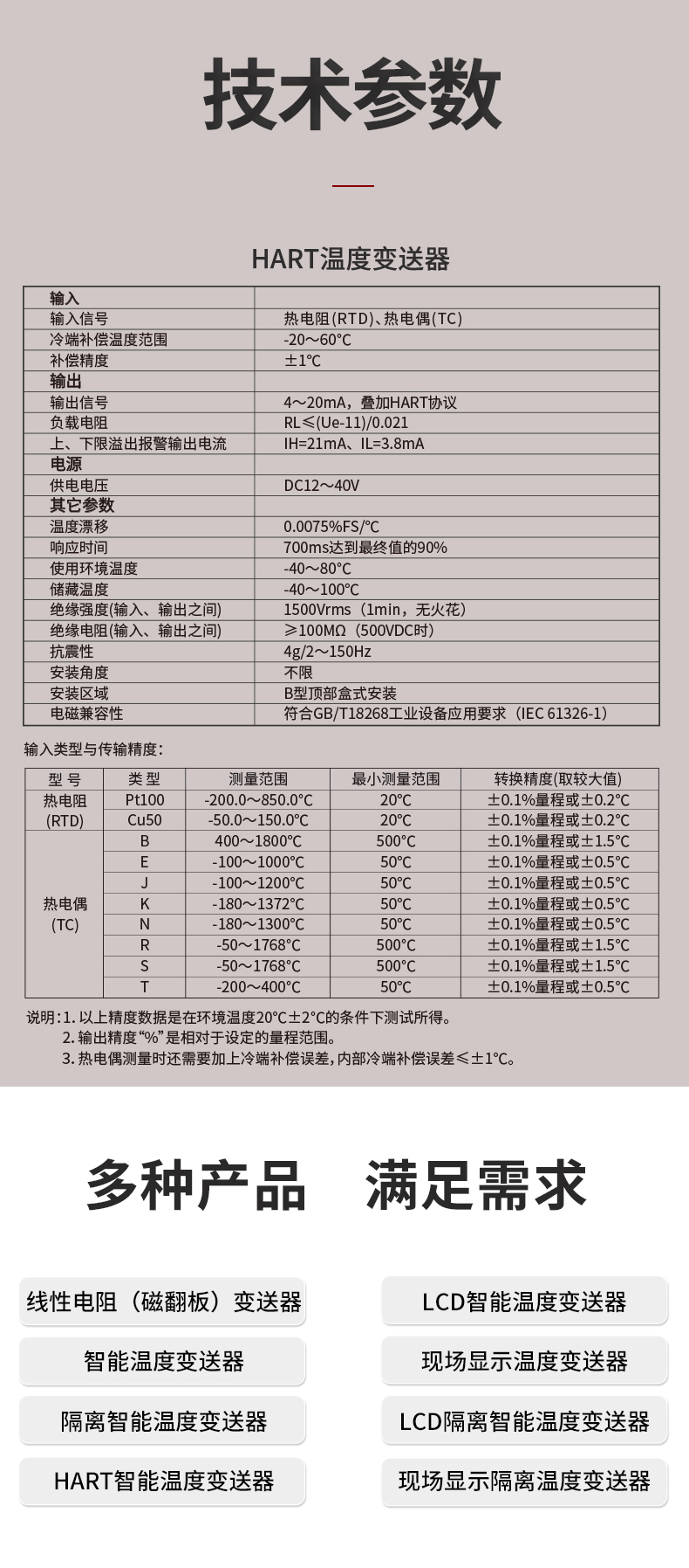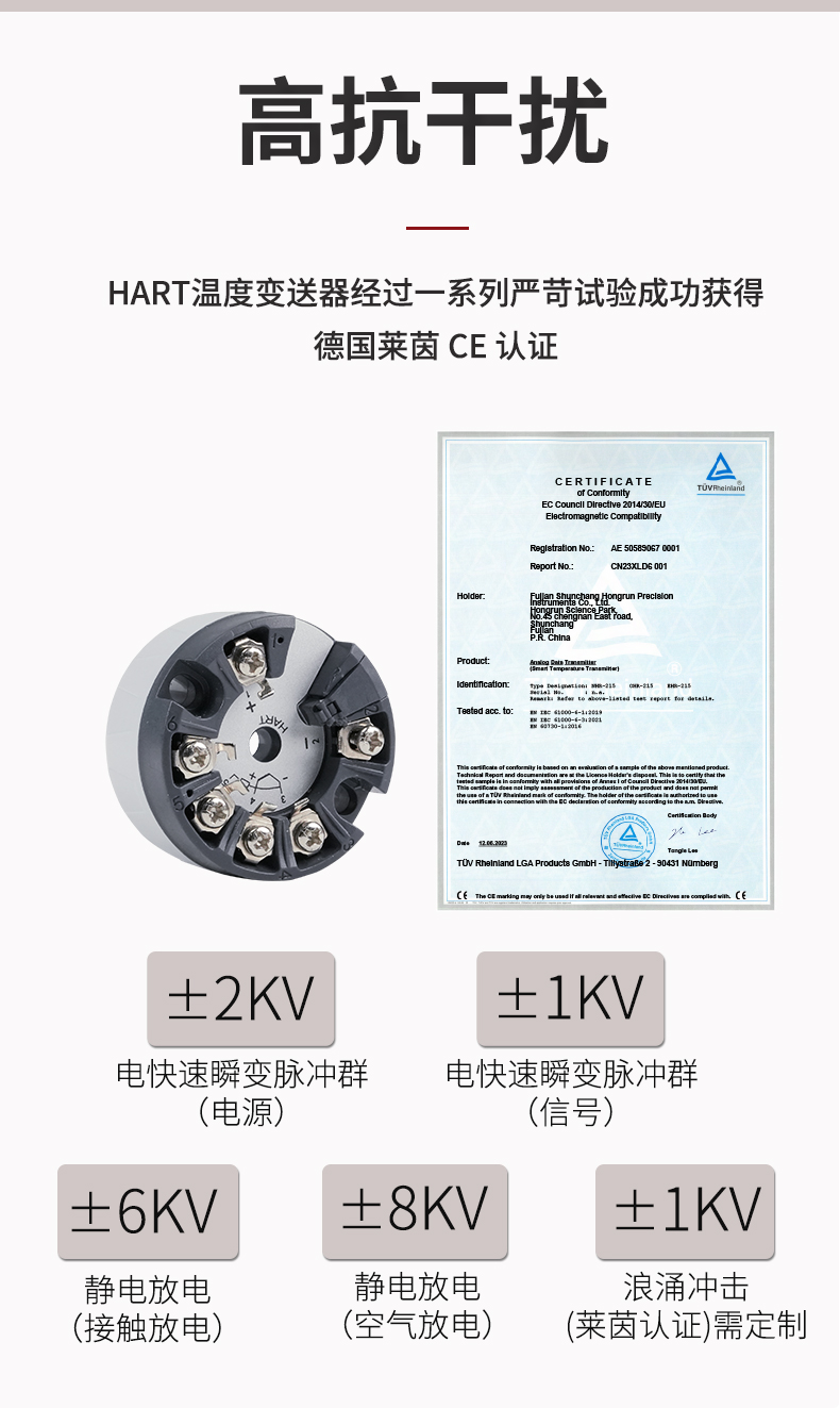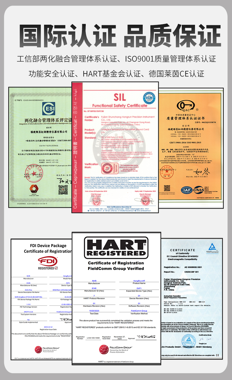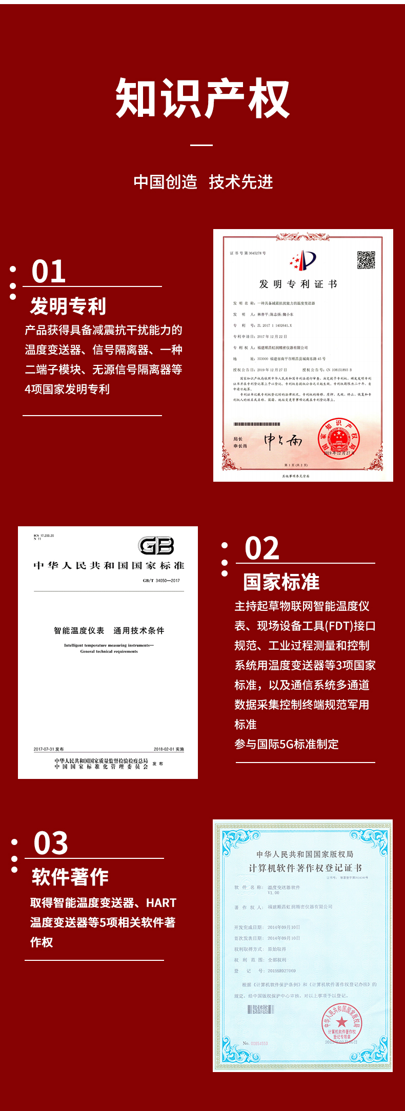 虹潤(rùn)公司是專(zhuān)業(yè)生產(chǎn)溫度變送器的國(guó)家專(zhuān)精特新“小巨人”企業(yè)。生產(chǎn)的智能溫度變送器,具有適配各類(lèi)溫度傳感器,精度高,穩(wěn)定性好,通過(guò)編程線修改輸入信號(hào)類(lèi)型及量程,高抗干擾等特點(diǎn)。該產(chǎn)品不僅通過(guò)HART基金會(huì)認(rèn)證、德國(guó)萊茵 CE 認(rèn)證與 SIL 功能安全認(rèn)證,還獲得具備減震抗干擾能力的溫度變送器、信號(hào)隔離器、一種二端子模塊、無(wú)源信號(hào)隔離器等4項(xiàng)國(guó)家發(fā)明專(zhuān)利,主持起草物聯(lián)網(wǎng)智能溫度儀表、現(xiàn)場(chǎng)設(shè)備工具(FDT)接口規(guī)范、工業(yè)過(guò)程測(cè)量和控制系統(tǒng)用溫度變送器等3項(xiàng)國(guó)家標(biāo)準(zhǔn),以及通信系統(tǒng)多通道數(shù)據(jù)采集控制終端規(guī)范軍用標(biāo)準(zhǔn),參與國(guó)際5G標(biāo)準(zhǔn)制定,取得智能溫度變送器、HART溫度變送器等3項(xiàng)相關(guān)軟件著作權(quán)。產(chǎn)品廣泛應(yīng)用于石油、化工、電力、冶金、制藥、食品、水處理等各種工業(yè)領(lǐng)域。