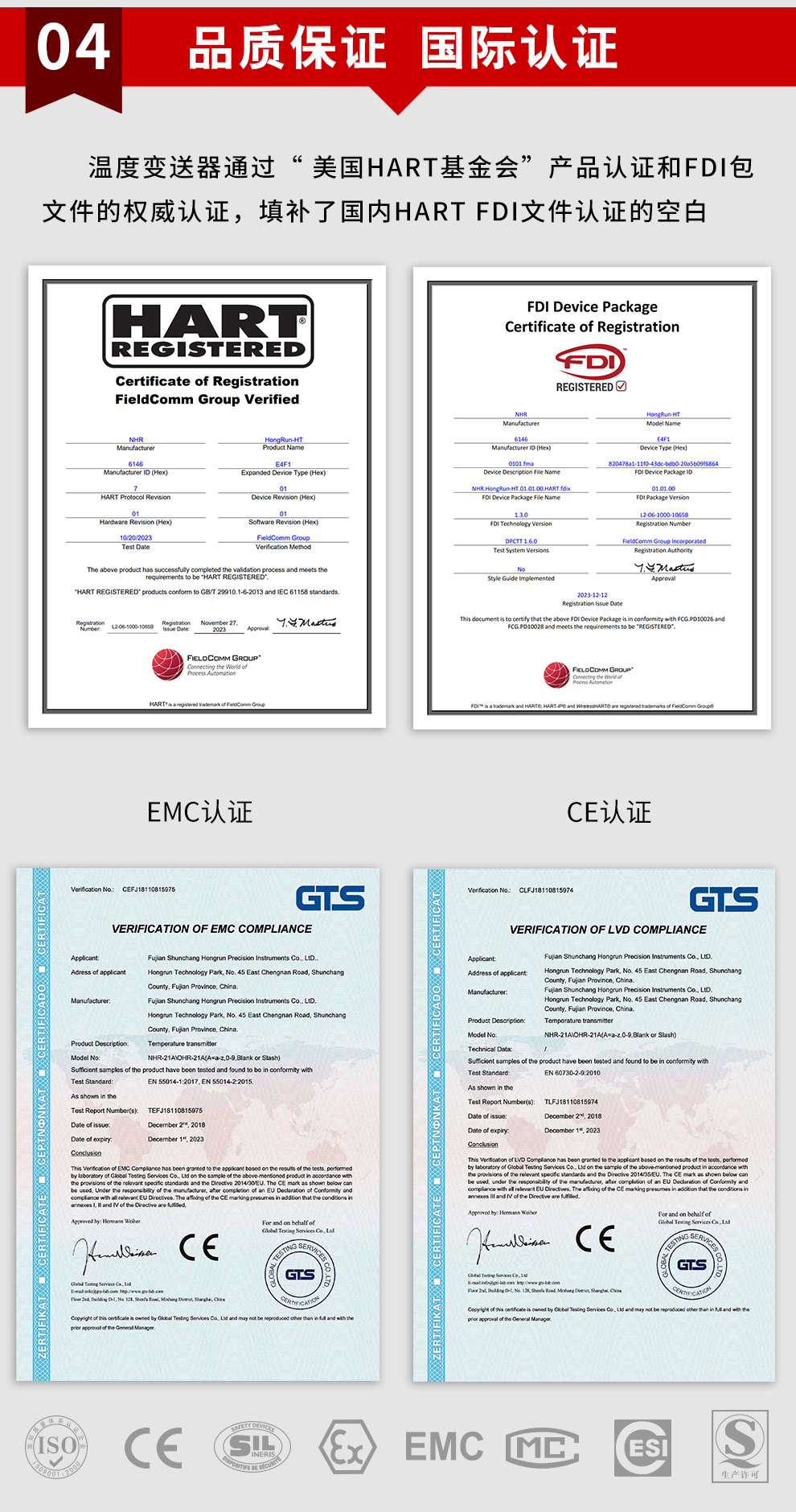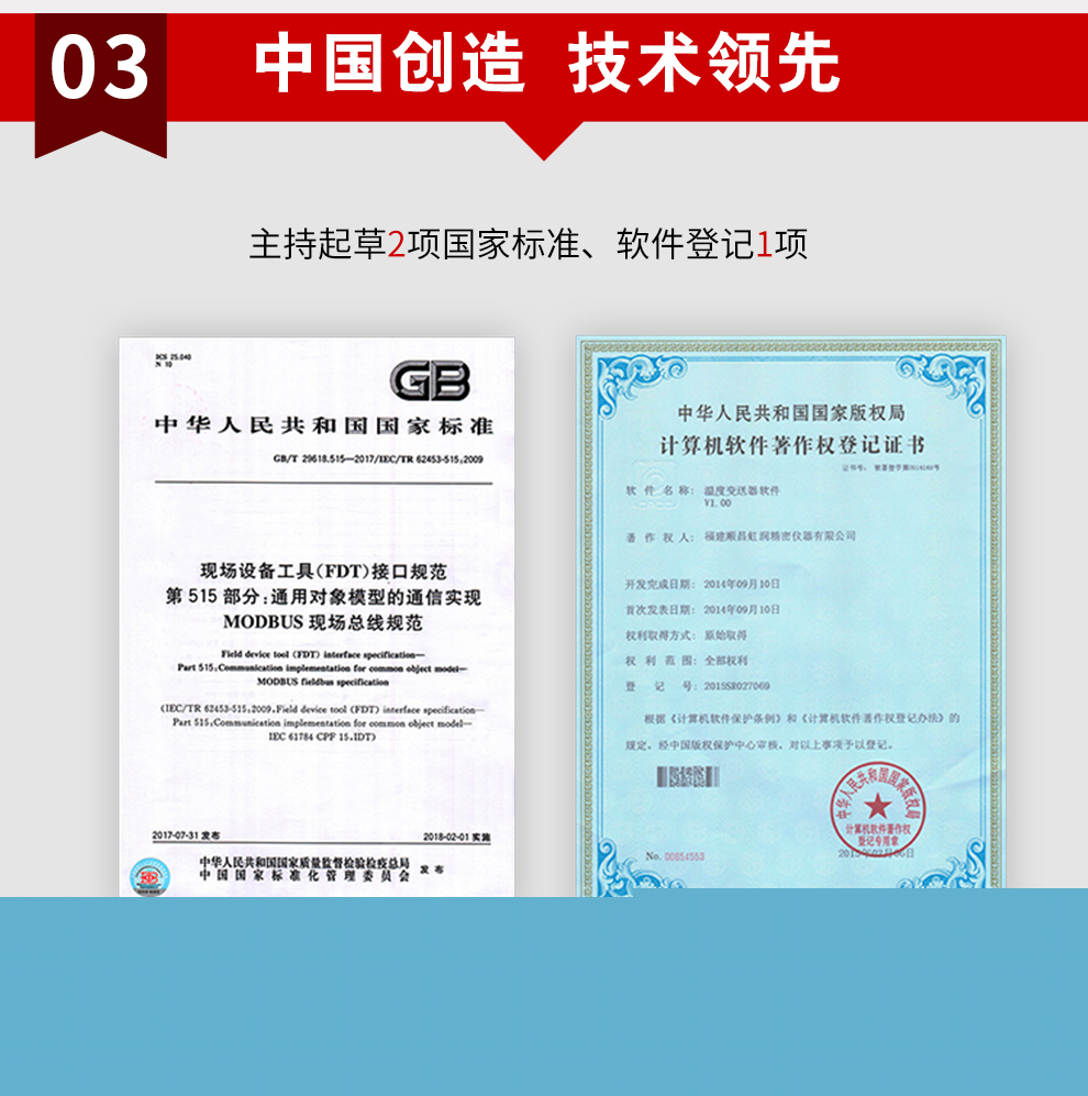 虹潤公司是專業(yè)生產(chǎn)溫度變送器的國家專精特新“小巨人”企業(yè)。生產(chǎn)的現(xiàn)場顯示隔離溫度變送器,具有可修改輸入信號類型,測量精度高,穩(wěn)定性好,帶HART或RS485通訊計(jì)等特點(diǎn)。該產(chǎn)品不僅通過德國萊茵 CE 認(rèn)證與 SIL 功能安全認(rèn)證,還獲得具備減震抗干擾能力的溫度變送器、信號隔離器、一種二端子模塊、無源信號隔離器等3項(xiàng)國家發(fā)明專利。主持起草物聯(lián)網(wǎng)智能溫度儀表、現(xiàn)場設(shè)備工具(FDT)接口規(guī)范、工業(yè)過程測量和控制系統(tǒng)用溫度變送器等3項(xiàng)國家標(biāo)準(zhǔn),以及通信系統(tǒng)多通道數(shù)據(jù)采集控制終端規(guī)范軍用標(biāo)準(zhǔn)。參與國際5G標(biāo)準(zhǔn)制定,取得高精度溫度變送器等3項(xiàng)相關(guān)軟件著作權(quán)。產(chǎn)品廣泛應(yīng)用于石油、化工、電力、冶金、制藥、食品、水處理等各種工業(yè)領(lǐng)域。