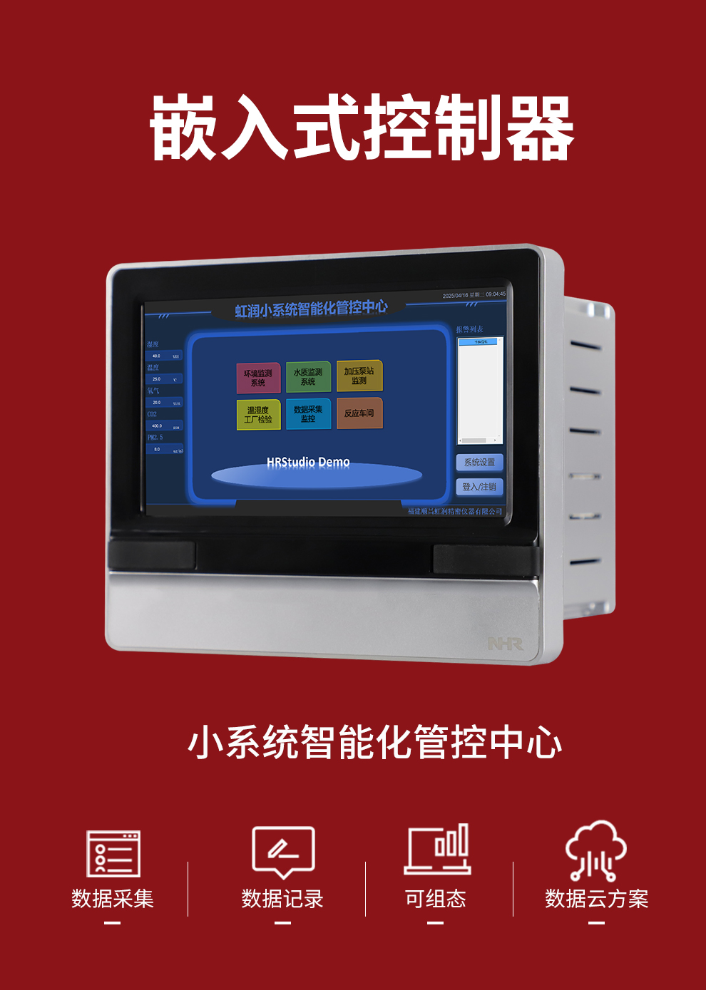 虹潤(rùn)公司是專業(yè)生產(chǎn)觸摸屏的國(guó)家專精特新“小巨人”企業(yè)。生產(chǎn)的嵌入式控制器,具有數(shù)據(jù)采集與記錄,內(nèi)置與外配組態(tài)軟件,數(shù)據(jù)云方案,RS485/以太網(wǎng)通訊等特點(diǎn)。產(chǎn)品獲得嵌入式數(shù)據(jù)采集工作站組網(wǎng)系統(tǒng)、數(shù)據(jù)采集工作站、無紙記錄儀、智能化控制器、巡回檢測(cè)顯示方法及裝置等5項(xiàng)國(guó)家發(fā)明專利;主持起草通信系統(tǒng)多通道數(shù)據(jù)采集控制終端規(guī)范軍用標(biāo)準(zhǔn),物聯(lián)網(wǎng)智能記錄儀表通用技術(shù)條件國(guó)家標(biāo)準(zhǔn),以及空間數(shù)據(jù)與信息數(shù)據(jù)傳輸系統(tǒng)等2項(xiàng)航天標(biāo)準(zhǔn),參與國(guó)際5G標(biāo)準(zhǔn)制定;取得嵌入式數(shù)據(jù)采集控制工作站以及HRStudio畫面組態(tài)軟件等4項(xiàng)相關(guān)軟件著作權(quán)。產(chǎn)品廣泛應(yīng)用于航天航空、化工、冶金、制藥、設(shè)備配套、現(xiàn)代農(nóng)業(yè)、環(huán)境監(jiān)測(cè)等諸多領(lǐng)域。