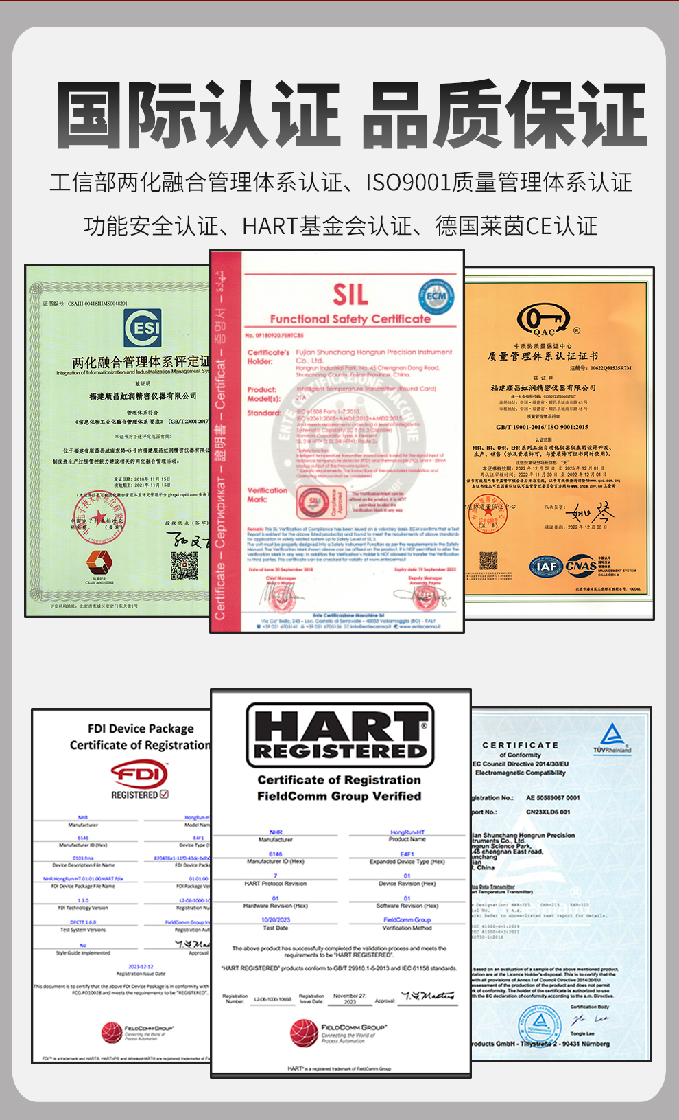 虹潤(rùn)公司是專(zhuān)業(yè)生產(chǎn)溫度變送器的國(guó)家專(zhuān)精特新“小巨人”企業(yè)。生產(chǎn)的智能溫度變送器,具有適配各類(lèi)溫度傳感器,精度高,通過(guò)編程線修改輸入信號(hào)類(lèi)型及量程,高抗干擾,HART或485通訊等特點(diǎn)。該產(chǎn)品不僅通過(guò)HART基金會(huì)認(rèn)證、德國(guó)萊茵 CE 認(rèn)證與 SIL 功能安全認(rèn)證,還獲得具備減震抗干擾能力的溫度變送器、信號(hào)隔離器、一種二端子模塊、無(wú)源信號(hào)隔離器等4項(xiàng)國(guó)家發(fā)明專(zhuān)利,主持起草物聯(lián)網(wǎng)智能溫度儀表、現(xiàn)場(chǎng)設(shè)備工具(FDT)接口規(guī)范、工業(yè)過(guò)程測(cè)量和控制系統(tǒng)用溫度變送器等3項(xiàng)國(guó)家標(biāo)準(zhǔn),以及通信系統(tǒng)多通道數(shù)據(jù)采集控制終端規(guī)范軍用標(biāo)準(zhǔn),參與國(guó)際5G標(biāo)準(zhǔn)制定,取得HART溫度變送器、智能溫度變送器等3項(xiàng)相關(guān)軟件著作權(quán)。產(chǎn)品廣泛應(yīng)用于石油、化工、電力、冶金、制藥、食品、水處理等各種工業(yè)領(lǐng)域。